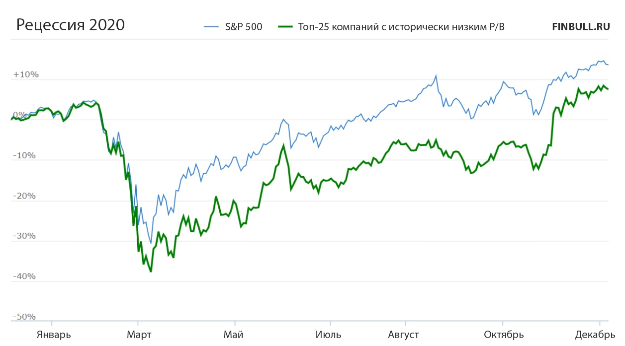 График сравнения компаний с исторически низким P/B в сравнении с широким индексом S&P 500: