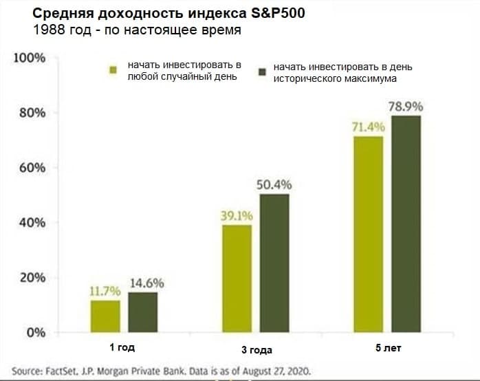 JPMorgan сильно заморочились и сделали сравнение двух вариантов инвестирования: случайный день против дня исторического максимума (сравнивали индекс S&P 500, самый популярный индекс).