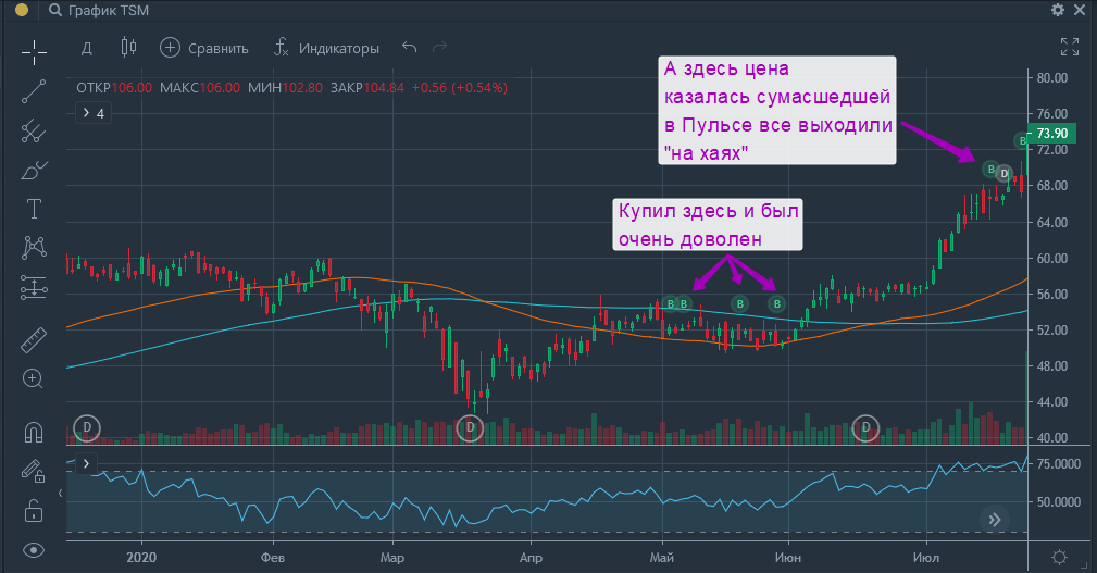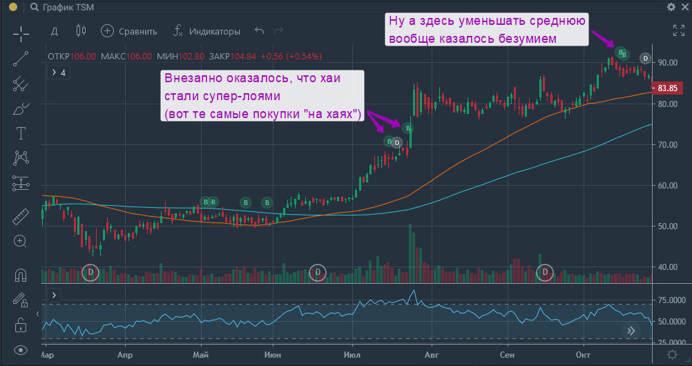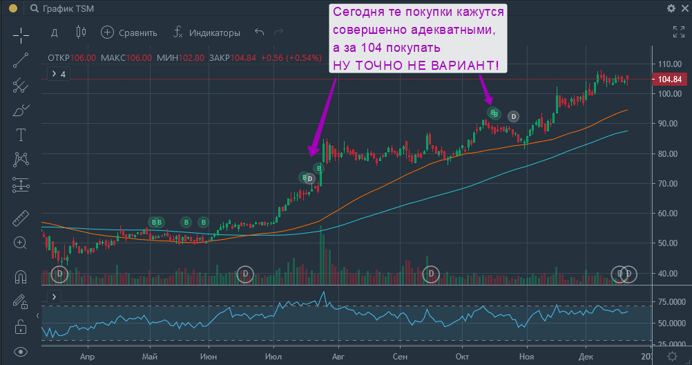 На сильном подъеме рынка можно покупать чуть меньше обычного. Но всегда помните, что текущий локальный хай всегда может через полгода показаться супер-удачной точкой входа. Посмотрите на пример покупки TSM в трех слайдах: