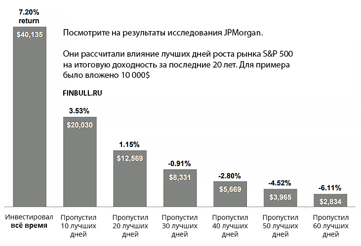 Посмотрите на результаты исследования JPMorgan. Они рассчитали влияние лучших дней роста рынка S&P 500 на итоговую доходность за последние 20 лет. Для примера было вложено 10 000$
